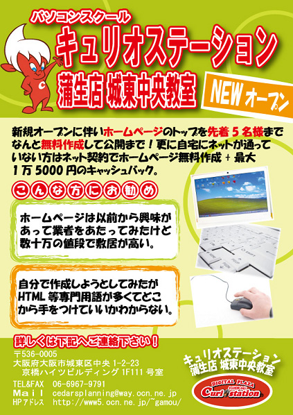 大阪市城東区、蒲生四丁目、京橋すぐのパソコン教室。ワード、エクセルの基礎からパソコン活用・MOS試験・WEBまで高レベルを低価格で。