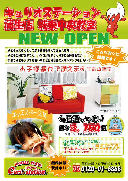 キュリオステーション蒲生店では、大阪市城東区を中心に近隣の店舗様や企業様からたくさんの制作ご依頼をいただいております。地域に密着した教室運営で培ったノウハウにより、チラシの作成だけでなく地域性に合わせた広告戦略まで合わせてご提案できます。