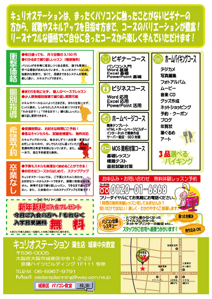 大阪市城東区、蒲生四丁目、京橋すぐのパソコン教室。ワード、エクセルの基礎からパソコン活用・MOS試験・WEBまで高レベルを低価格で。